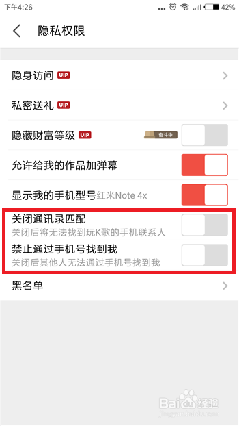 点击进入到隐私权限设置界面后,把【封闭通信录匹配】和【禁止经由过程手机号找我】都给封闭,如许熟悉我们的人就拜候不了我们了,也就不会呈现在比来听众中了。