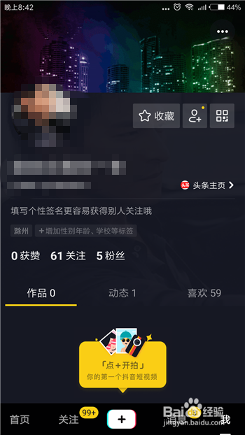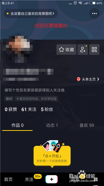 点击后会进入到抖音的小我中间,在顶部就是我们的布景,点击布景中肆意处所。