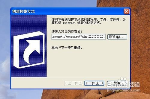 然后接下来,我们进入了新建快捷体例的标的目的导,我们需要在标的目的导里面输入以下信息:tencent://message/?uin=老友QQ号码,然后点击下一步。