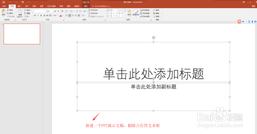 打开PPT 2016软件,选择新建一个空白的演示文稿,并在新建的演示文稿中将自带的占位符文本框选中按delete删除键进行删除。