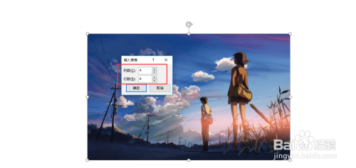 仍是在插入菜单中,此次是插入表格号令,执行插入表格,弹出“插入表格”设置窗口,设置插入表格的列数与行数都为4,点击确定进行插入。