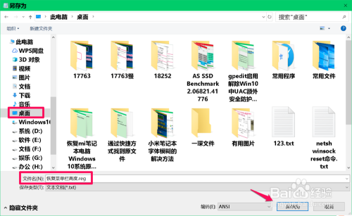在另存为窗口中,先点击窗口左侧 的【桌面】,在文件名(N)栏中输入:恢复菜单栏高度.reg,再点击:保留;