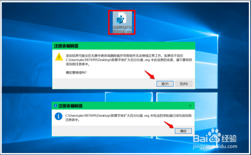 在系统桌面上,我们找到并左键双击【恢复菜单栏高度.reg】注册表文件图标,在先后弹出的注册表编纂器对话框中点击:是(Y)和确定。