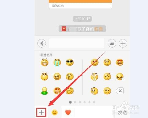 然后在微信聊天输入框的脸色包页面,点击左下角的加号,也就是添加微信脸色的加号。