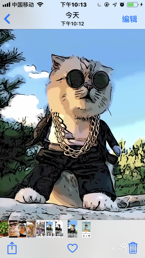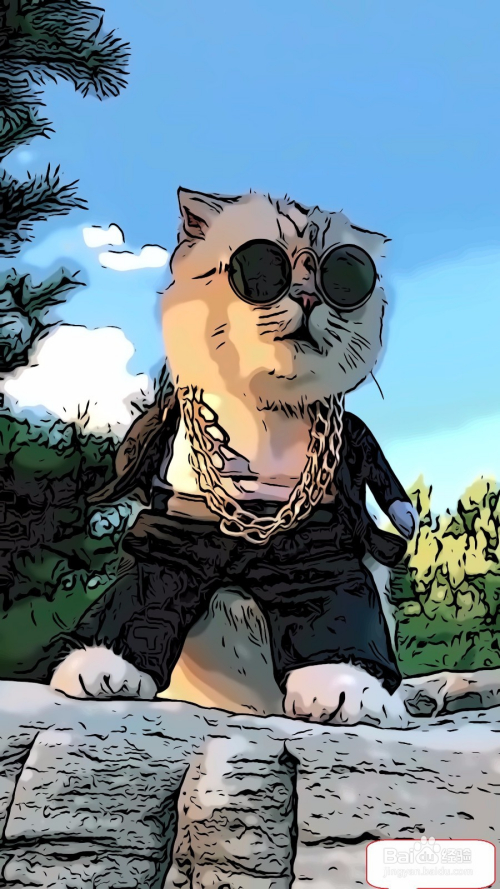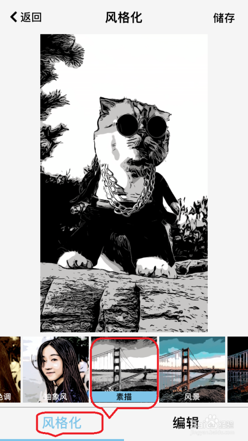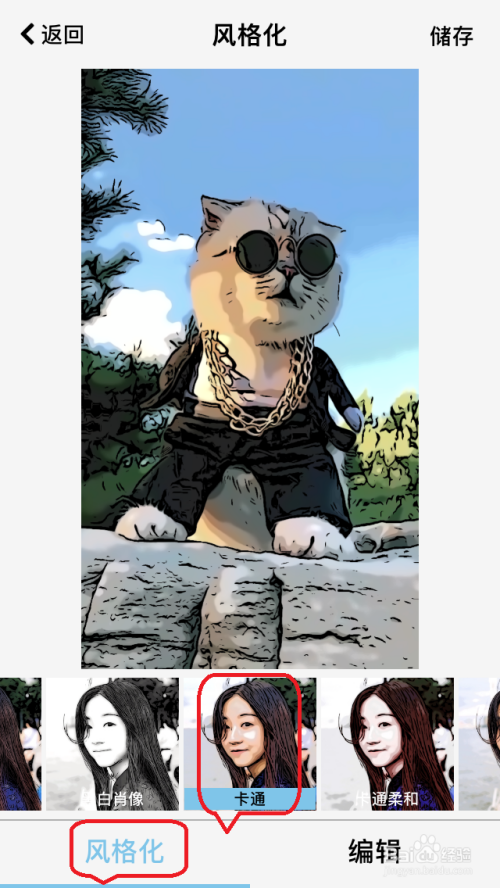 点击“气概化”,标的目的右滑动,别离找到并点击“卡通”、“素描”,即可应用“卡通”、“素描”气概到添加的照片上。