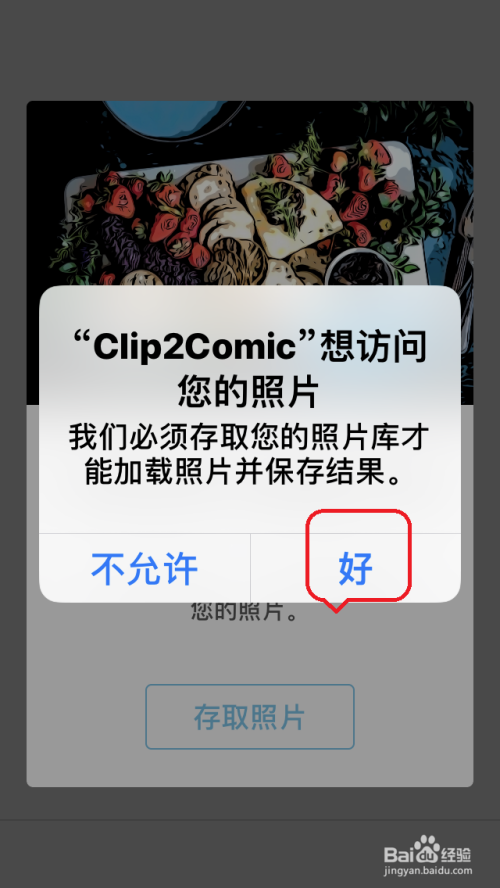 点击“存取照片”授权存取照片,点击“好”许可应用拜候手机相册。