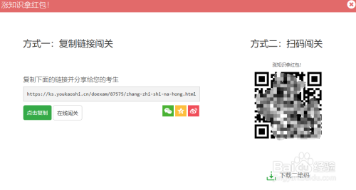 建立闯关后,把闯关的链接或者二维码分享出去,即可让你的考生在线闯关答题拿红包啦!