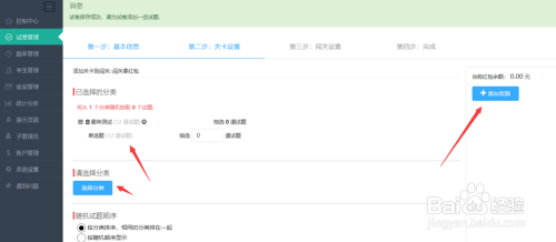 为你的闯关添加试题,点击“选择分类”,按分类抽取标题问题(仅撑持单选题)。抽取完标题问题后,点击【添加奖励】,进行奖励设置。