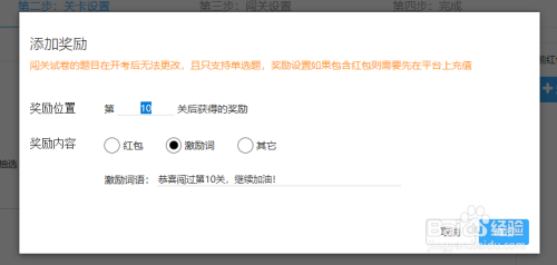 1.红包奖励:用户可在某个关卡后添加红包奖励,可设置金额随机或固定(单个红包金额须≧0.3)。