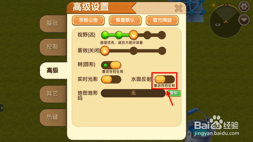 在高级选项下,将水面反射的开关打开。