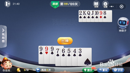 第119关先打出三张9,接着打出3-7顺子就过关了。