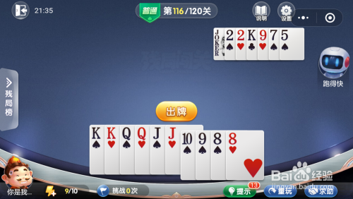 跑得快打出一张小王,接着打出一张7,然后我打出一张10就过关了。