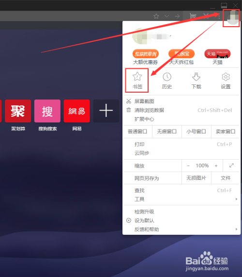 点击浏览器中的头像,在弹出头具名板中找到“书签”。