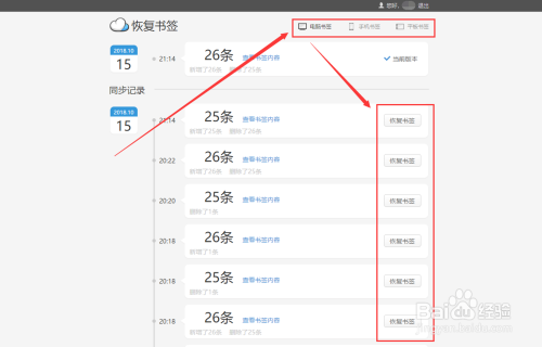 然后就能拜候书签的云端备份数据了。这里能找到“电脑书签”、“手机书签”以及“平板书签”的备份,选择被误删书签的客户端,鄙人面找到汗青书签,选择恢复即可。