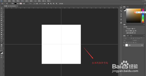 按快捷键Ctrl+R显示标尺,然后从标尺中拉出两条参考线出来,两条参考线的位置正好将画布分为相等的四份。