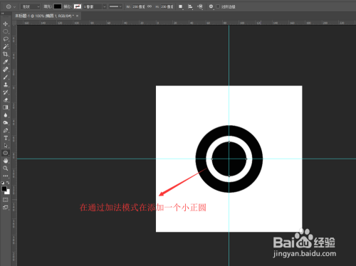 在按住shift辅助键,这时辰会看到鼠标的状况酿成了外形加上模式,这时辰我们在沿着两天参考线的中心点在绘制一个更小的正圆,松开鼠标,中心空白位置就多了一个更小的正圆外形。