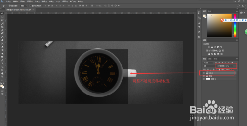 在置入我们的第二章素材图:一个时钟素材,将其也拖入PS画布中,降低该图层的不透明度,然后移动时钟素材,将其与咖啡杯的素材进行对齐即可。