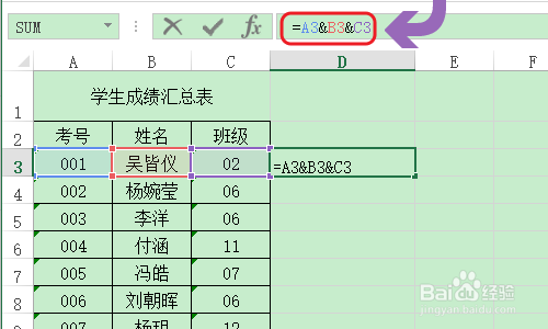 接着在该单位格输入以下公式“=A3&B3&C3”(前三列单位格),如许即可将前面三列的内容同一归并到新的单位格了;