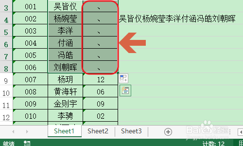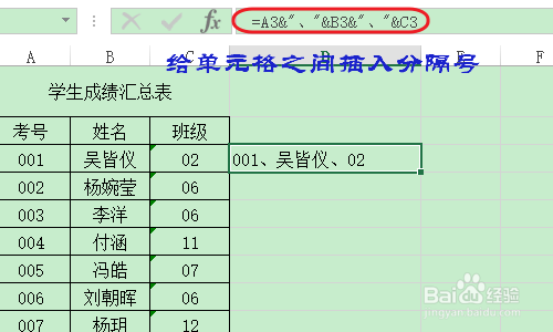 若是我们还想在每个内容之间插入朋分符号,那么将适才的公式更改为“=A3&"、"&B3&"、"&C3”即可,下图就是插入分隔号今后的结果...