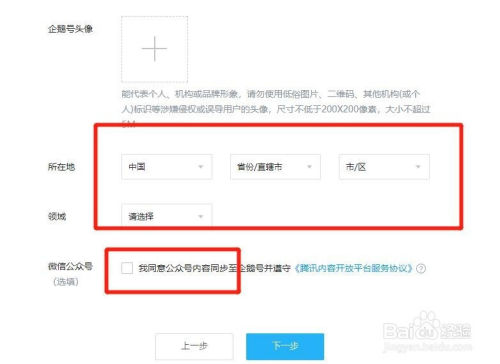 接下来就是填写小我信息等问题,包罗企鹅号名称、简介、地域、范畴等,最后一步赞成微信公家号内容是否同步到企鹅号,这不成以不写,若是你又本身的微信公家号,则可以勾选,若是没有就可以跳过这个步调,直接下一步就可以了