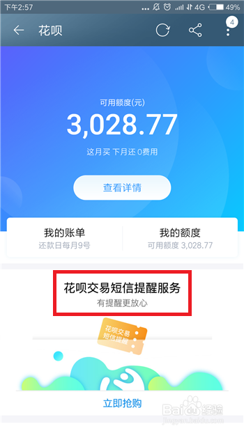 点击后会进入到花呗界面,在界面中找到并点击【花呗买卖短信提醒办事】。