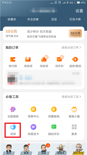 在淘宝的小我中间界面中找到【必备东西】下方的【花呗】功能并点击打开该功能。