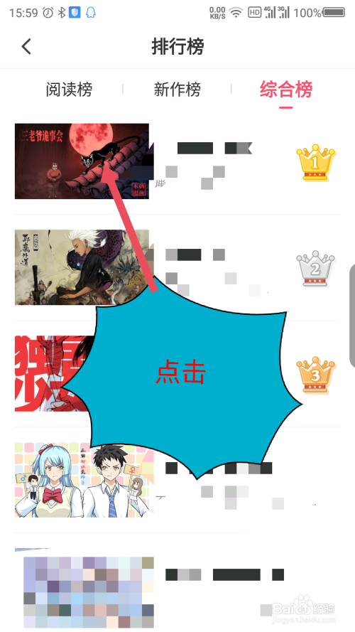打开综合榜后,在漫画列表中,点击最上面的热度最高的漫画不雅看。如图所示