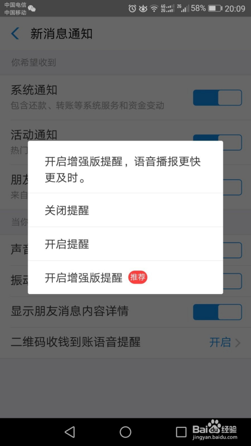 或者点击“二维码收钱到账语音提醒”右侧的小三角,在弹出的对话框中选择“开启加强版语音提醒”