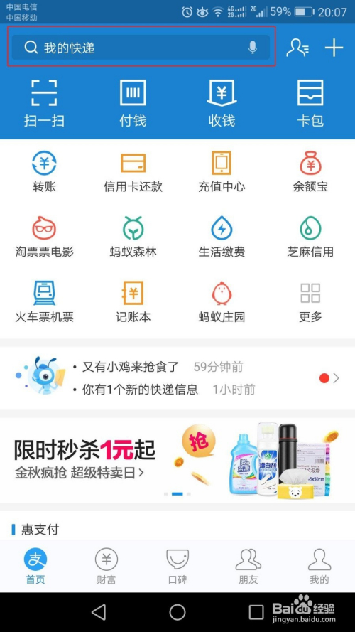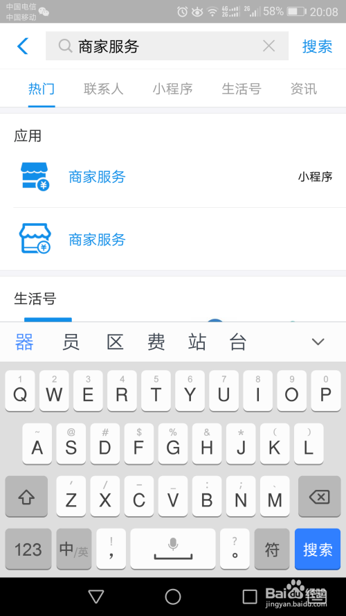 打开手机付出宝,在搜索框内搜刮“商家办事”