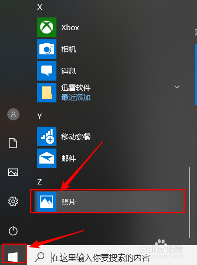 打开电脑,单击左下角的win图标,在起头栏拉倒最后,选择“照片”,单击,打开。如下图。