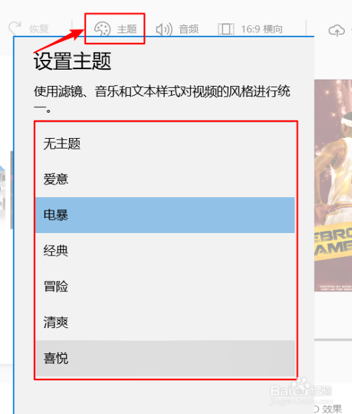 在右上角,你可以设置视频的本家儿题,有片子、经典和冒险等多种本家儿题选择。