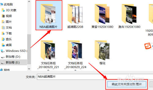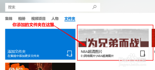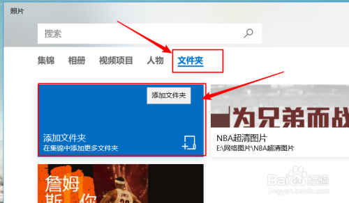 来到照片界面,如下图。点击“文件夹”,然后点击“添加文件夹”,找到你手里照片存放的文件夹,接着点击右下角的“将此文件夹添加到 图片”即可。