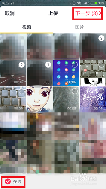 点击后会打开手机的视频界面,在视频中点击左下角的【多选】,然后选择适才保留的捏脸视频,选择好后点击右上角的【完当作】。