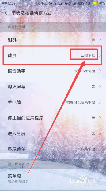 然后找到 截屏 这个选项,它此刻是设置为 三指下拉截屏的,点击它。