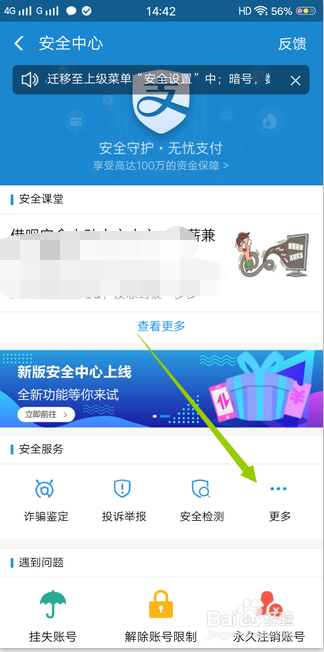 然后打开付出宝平安中间,这里可以对账号平安进行设置,还可以刊出账户哦,点击下方诸多功能右侧的更多按钮。