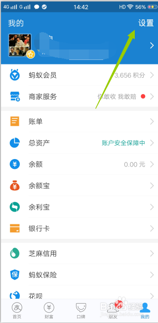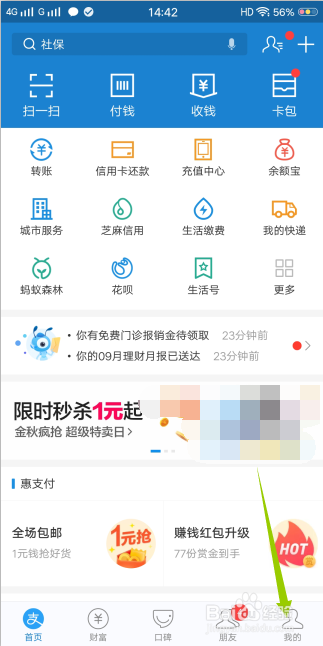 打开手机付出,进入到首页,点击右下角的【我的】选项,在小我界面中,选择右上角的设置按钮。