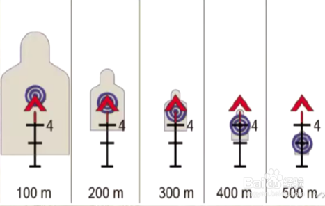 300米-400米距离利用镜头中间下面3格刻度对准;