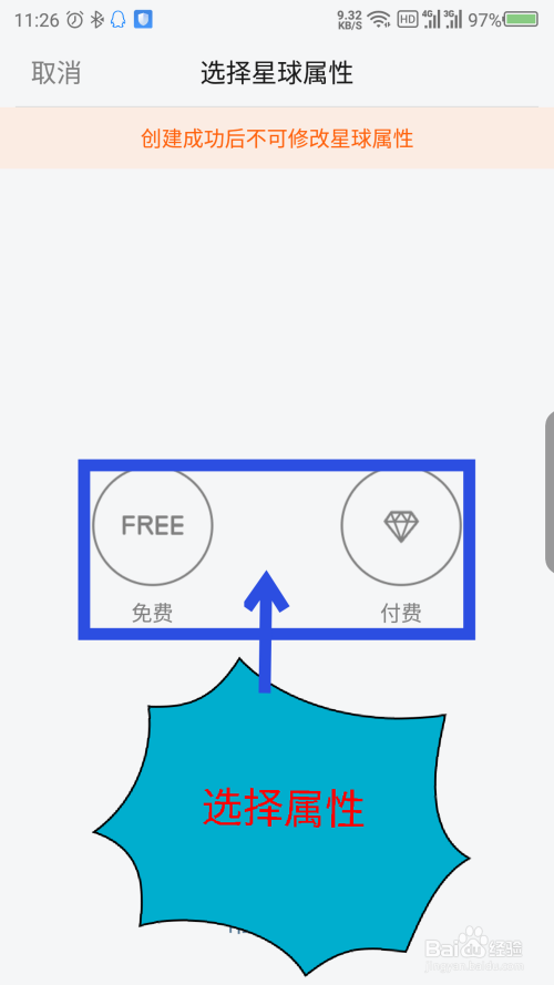 绑定当作功后,继续建立星球。打开一个选择星球属性的界面,点击免费或者付费。如图所示