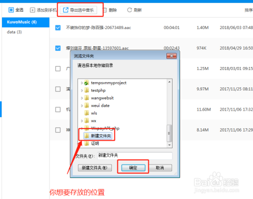 选中要下载的内容后找到上方的“导出选中的音乐”点击进去,会弹出对话框让你选择存放的地址,选择一个地址点击确定就可以了