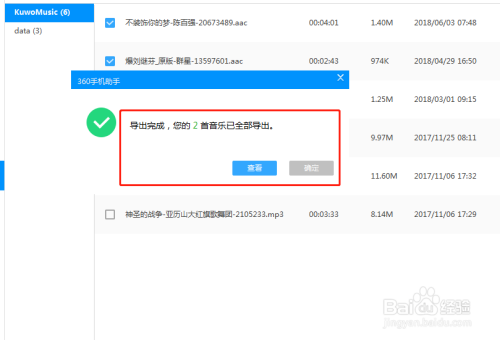 若是点击“导出选中的音乐”,导出当作功后会提醒导出的成果,在对话框的“查看”中可以查看已经下载到电脑的音乐文件,其他的内容导出也是近似的操作待都导出后可以再倒入到新的手机里