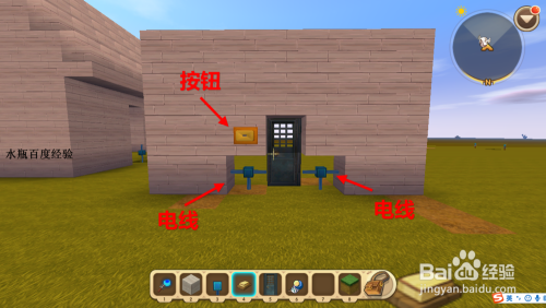把挨着铁门的两个方块敲失落,放上电线导电。然后在一面墙的四周放置一个按钮。