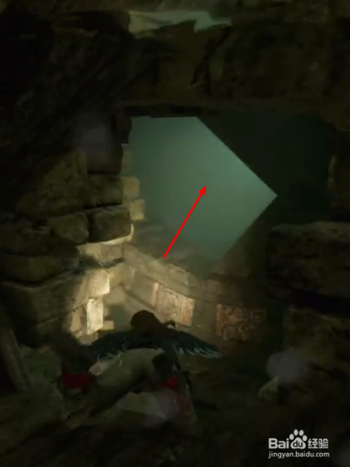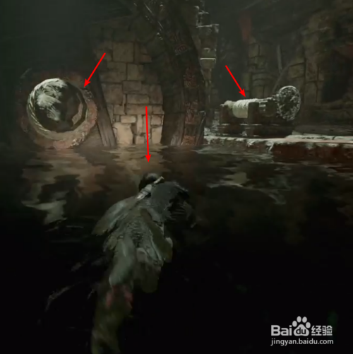 来到一处机关,右边箭头所指是动弹的机关,中心箭头是要潜下去断根障碍物,左边箭头就是要动弹的转轮。