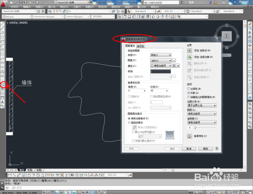因为墙体属于双层填充,我们先填充第一层图案。点击【图案填充】,弹出图案填充渐变色对话框。点击选项版,按照划定选好墙体首层填充样式。点击【添加拾取点】,拔取墙体部门,点击【确定】,完当作填充;
