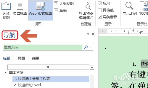 按照以上的方式将文档设置好今后,今后想要快速查找,那就要点击“视图”-“导航窗格”,然后将导航窗格前面的复选框勾选,如许就会在软件左侧弹出一个窗口,里面有目次列表,点击即可快速跳转到文档对应处,如图所示...