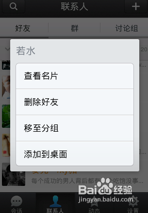 找到本身想要删除的老友的手刺,然后长按该老友手刺,然后就弹出了选项列表。