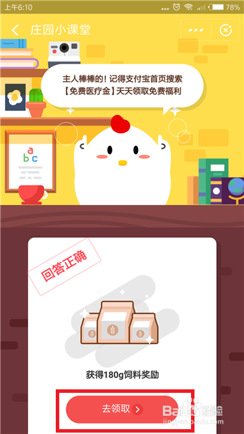点击后会打开领饲料使命界面,此中有一个使命就是【庄园小讲堂】,点击【去答题】。