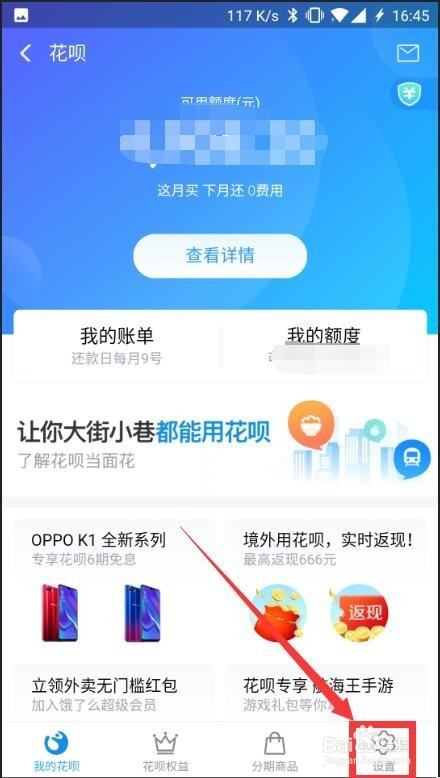 进入后可以看到本身的蚂蚁花呗的首页,这里可以看到本身是否已经清账,若是清账了点击右下角的设置