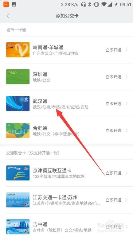 选择你的城市的公交卡,这里我选择武汉通,点击当即开通