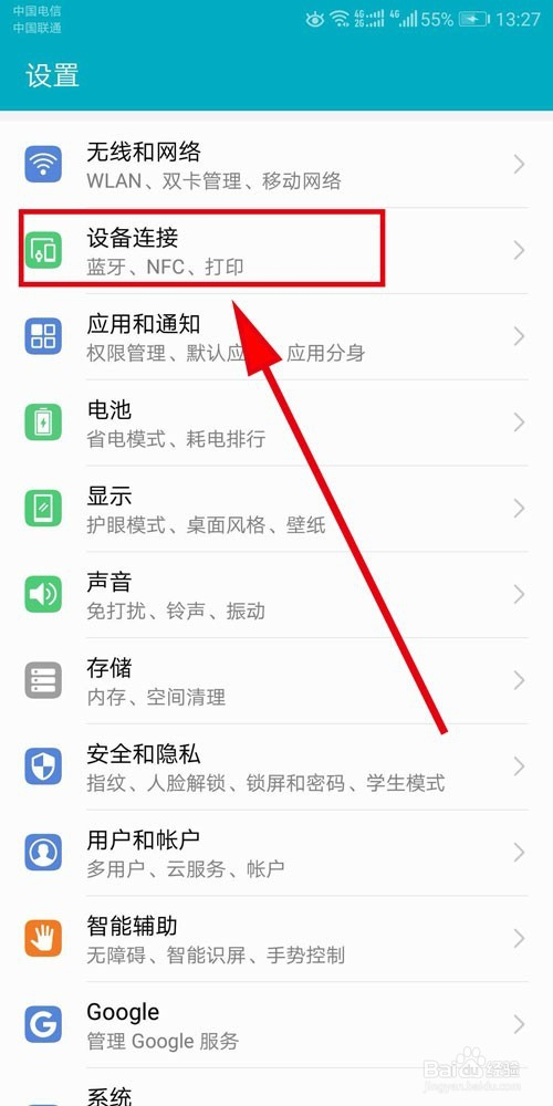 在“设置”里找到“设备毗连”,打开它