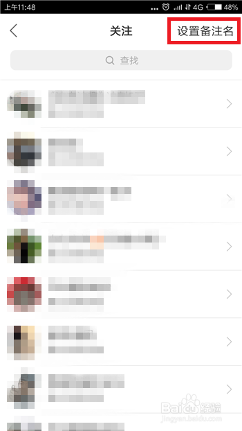 点击后打开的就是存眷界面了,在这里面可以看到所有存眷的人,为了便于分辩可以对老友进行备注名,点击右上角的【设置备注名】。